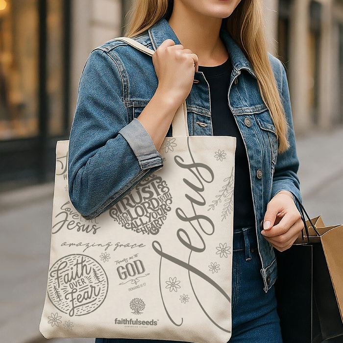 Women’s Canvas Tote Bag “Jesus, Faith Over Fear” – Bible Scripture & Floral Design – Reusable Shoulder Tote for Bible, books, Everyday use.